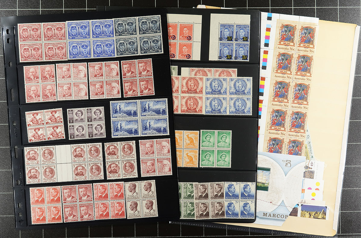 Accumulation of primarily never hinged Australia, 1920's-2000's, containing over 1,000 stamps in a variety of formats including stock pages, glassines, 102 cards, thematic packs and more. We note several singles, blocks, sets, including back of the book material, and some used stamps, with a cursory check indicating some material cataloguing $10 and up each, with face value alone being a few hundred dollars. A nice lot with a little bit of everything, ideal for the Australia or worldwide collector, or dealer looking for stock. Online photos show an overview. Estimate =