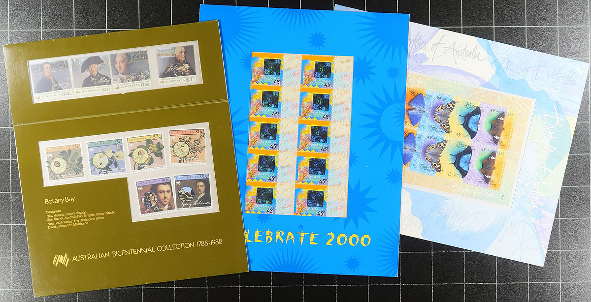 Accumulation of primarily never hinged Australia, 1920's-2000's, containing over 1,000 stamps in a variety of formats including stock pages, glassines, 102 cards, thematic packs and more. We note several singles, blocks, sets, including back of the book material, and some used stamps, with a cursory check indicating some material cataloguing $10 and up each, with face value alone being a few hundred dollars. A nice lot with a little bit of everything, ideal for the Australia or worldwide collector, or dealer looking for stock. Online photos show an overview. Estimate =