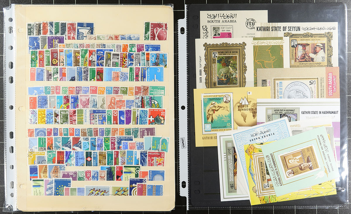 Organized grouping of mint and used worldwide stamps in 28 stockpages, 1880's-2004. The lot contains roughly 1,500 stamps with representation from a handful of countries and regions, including Switzerland, Belgium, Scandinavia (primarily Faroe Islands), Asia (China and South Korea), Argentina, and a few other countries. We note mint and or used singles, sets, and a few souvenir sheets, with a spot check indicating items cataloguing $10 and up. Owner's 2017 Scott catalogue value for the lot totals US$1,204.00 ($1625.40 CDN), leaving potential finds for the worldwide collector. A fairly well organized lot considering the amount of material, overall fine to very fine. Estimate =