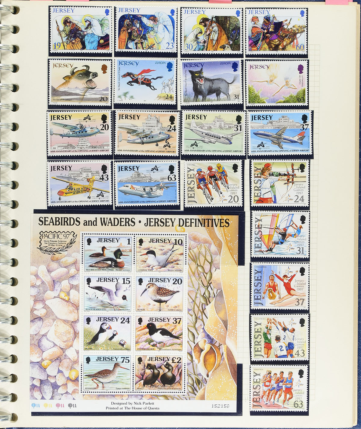 Lovely never hinged collection of Jersey, 1941-2002, containing roughly 1,125 stamps, neatly organized on homemade pages in hingeless mounts, housed in a binder. The collection ranges from Scott #N1/1023, containing primarily sets and souvenir sheets, with a spot check indicated some items cataloguing $10 to $25 and up each, with a 2026 Scott catalogue value for the collection totaling US$1,109.00 ($1497.15 CDN). A lovely lot for topical and thematic collectors as we spotted several suitable subjects including planes, ships, birds, royalty, flowers, and more. Clean and very fine. Estimate =