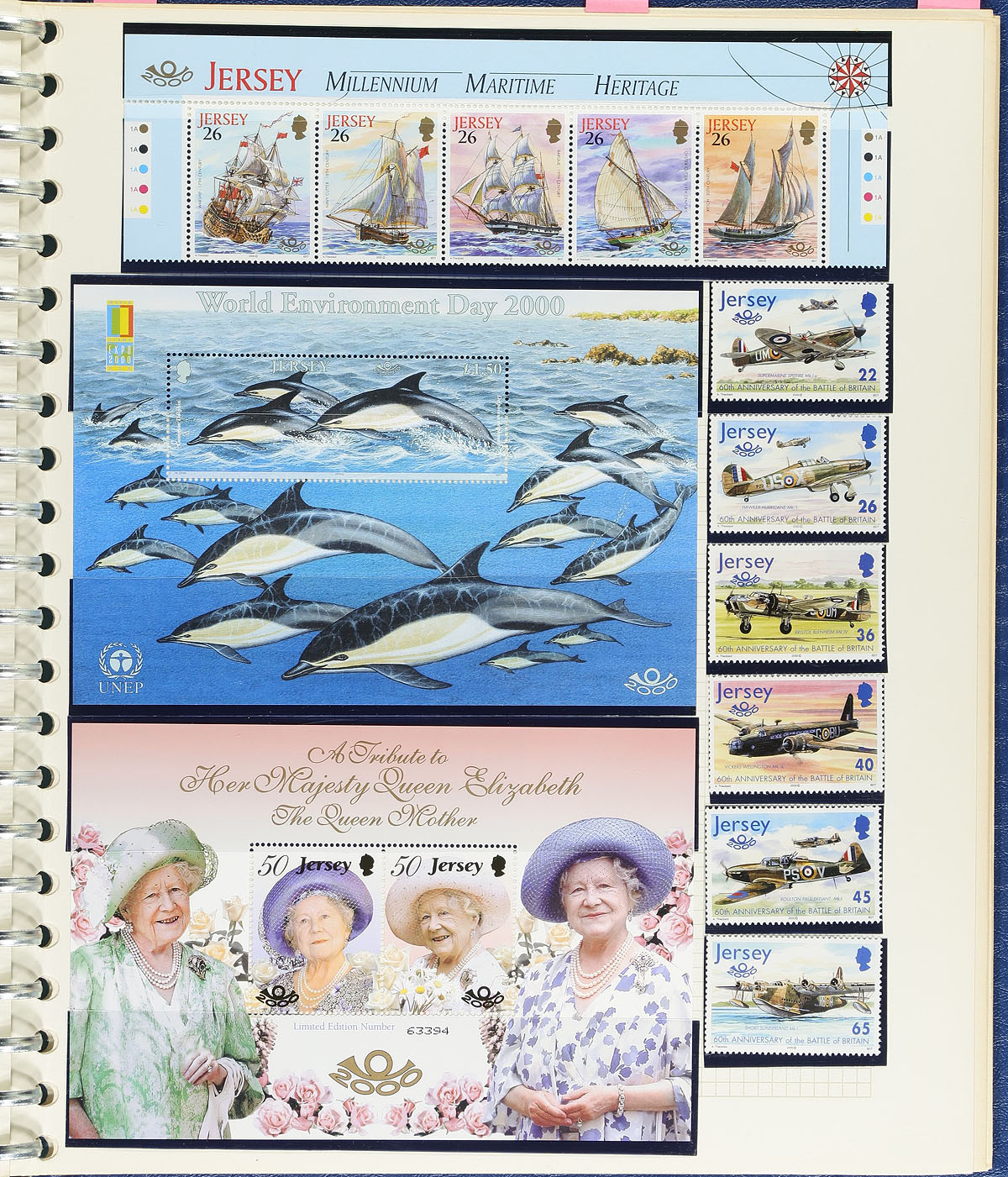 Lovely never hinged collection of Jersey, 1941-2002, containing roughly 1,125 stamps, neatly organized on homemade pages in hingeless mounts, housed in a binder. The collection ranges from Scott #N1/1023, containing primarily sets and souvenir sheets, with a spot check indicated some items cataloguing $10 to $25 and up each, with a 2026 Scott catalogue value for the collection totaling US$1,109.00 ($1497.15 CDN). A lovely lot for topical and thematic collectors as we spotted several suitable subjects including planes, ships, birds, royalty, flowers, and more. Clean and very fine. Estimate =