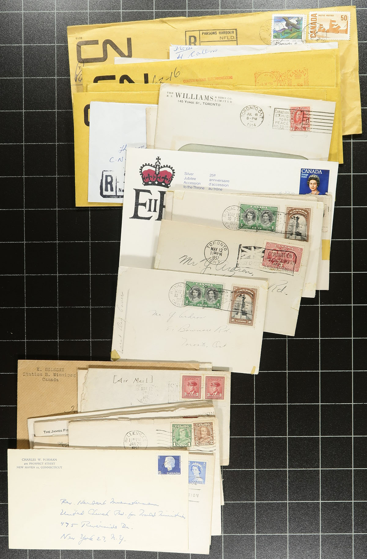 Group of a few hundred of covers in a plastic bin, 1900's-2000's. A cursory glance of the lot indicated a wide variety of items within including a few Victorian era items, post cards, postal stationery, first flight covers (including Unitrade #C4 fdc, c.v. $40), postage due, registered mail, cheques with revenue and regular issues, first day covers (including private cachets), corner advertising envelopes, royal train covers, and more, including an 1852 money letter Cumberland C.W. to Kingston, Regiments first day cover (c.v. $125), and other potential finds. Postmark interest includes cds, duplex, POCON, slogan, Barrel, and probably others. An interesting lot for the postal history collector, with condition ranging from mixed to better. Estimate =