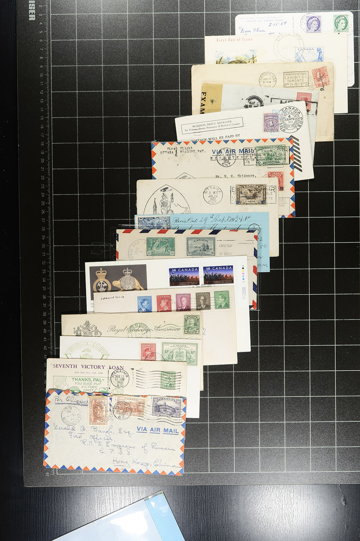Group of a few hundred of covers in a plastic bin, 1900's-2000's. A cursory glance of the lot indicated a wide variety of items within including a few Victorian era items, post cards, postal stationery, first flight covers (including Unitrade #C4 fdc, c.v. $40), postage due, registered mail, cheques with revenue and regular issues, first day covers (including private cachets), corner advertising envelopes, royal train covers, and more, including an 1852 money letter Cumberland C.W. to Kingston, Regiments first day cover (c.v. $125), and other potential finds. Postmark interest includes cds, duplex, POCON, slogan, Barrel, and probably others. An interesting lot for the postal history collector, with condition ranging from mixed to better. Estimate =