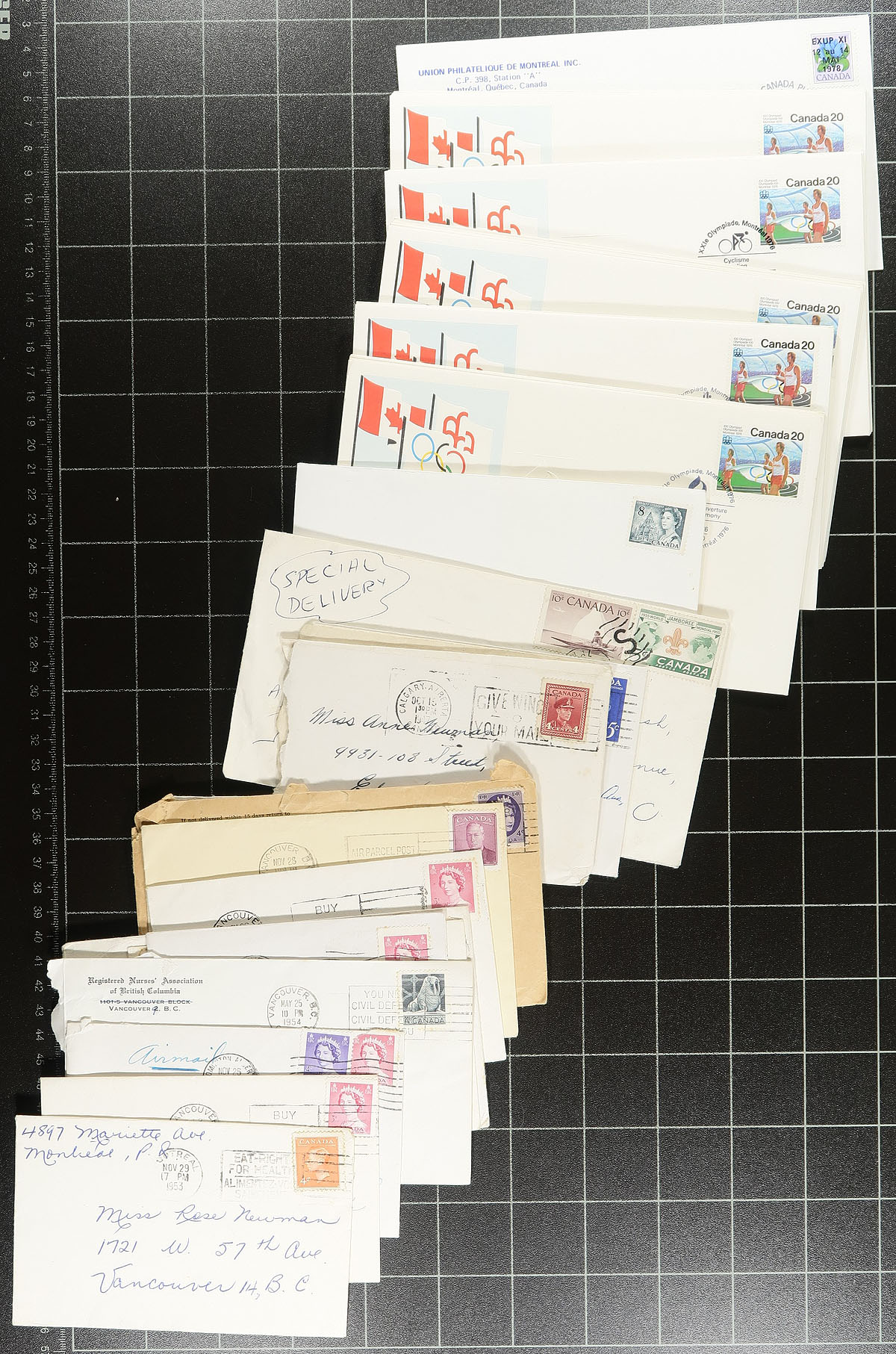 Group of a few hundred of covers in a plastic bin, 1900's-2000's. A cursory glance of the lot indicated a wide variety of items within including a few Victorian era items, post cards, postal stationery, first flight covers (including Unitrade #C4 fdc, c.v. $40), postage due, registered mail, cheques with revenue and regular issues, first day covers (including private cachets), corner advertising envelopes, royal train covers, and more, including an 1852 money letter Cumberland C.W. to Kingston, Regiments first day cover (c.v. $125), and other potential finds. Postmark interest includes cds, duplex, POCON, slogan, Barrel, and probably others. An interesting lot for the postal history collector, with condition ranging from mixed to better. Estimate =