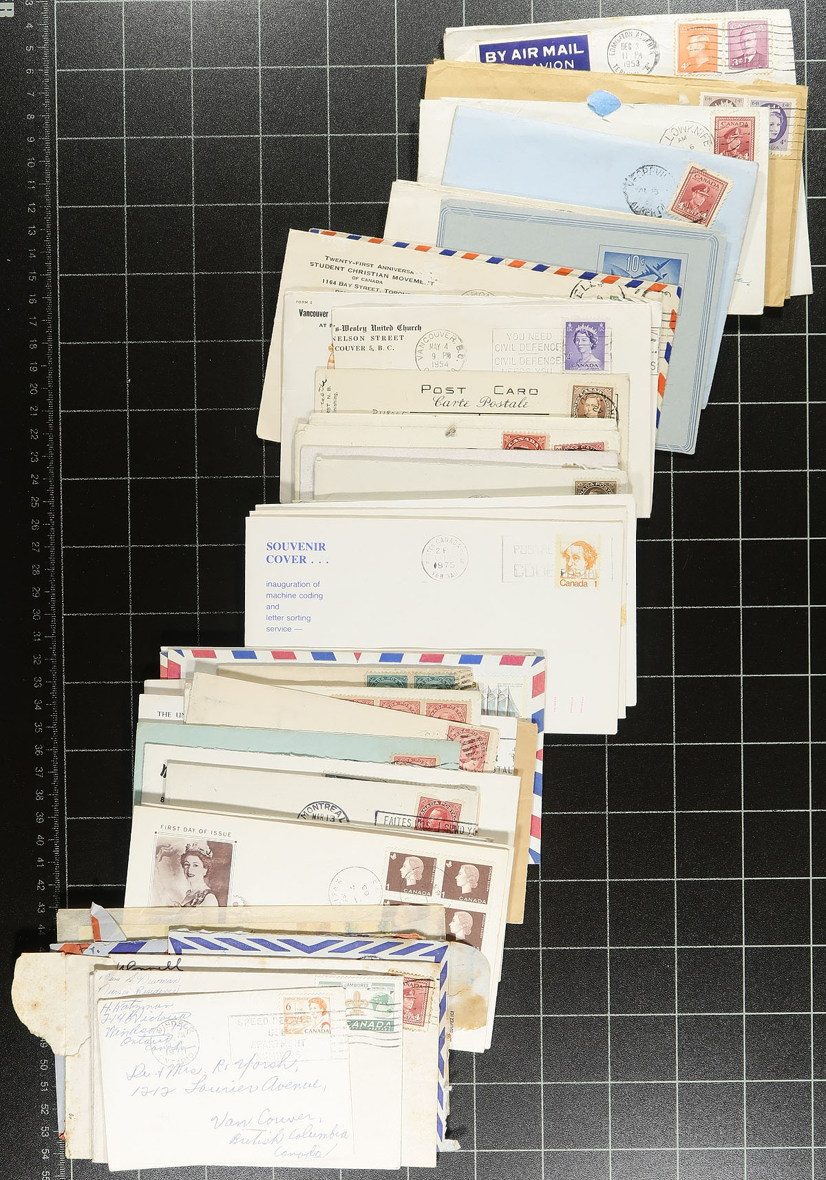 Group of a few hundred of covers in a plastic bin, 1900's-2000's. A cursory glance of the lot indicated a wide variety of items within including a few Victorian era items, post cards, postal stationery, first flight covers (including Unitrade #C4 fdc, c.v. $40), postage due, registered mail, cheques with revenue and regular issues, first day covers (including private cachets), corner advertising envelopes, royal train covers, and more, including an 1852 money letter Cumberland C.W. to Kingston, Regiments first day cover (c.v. $125), and other potential finds. Postmark interest includes cds, duplex, POCON, slogan, Barrel, and probably others. An interesting lot for the postal history collector, with condition ranging from mixed to better. Estimate =
