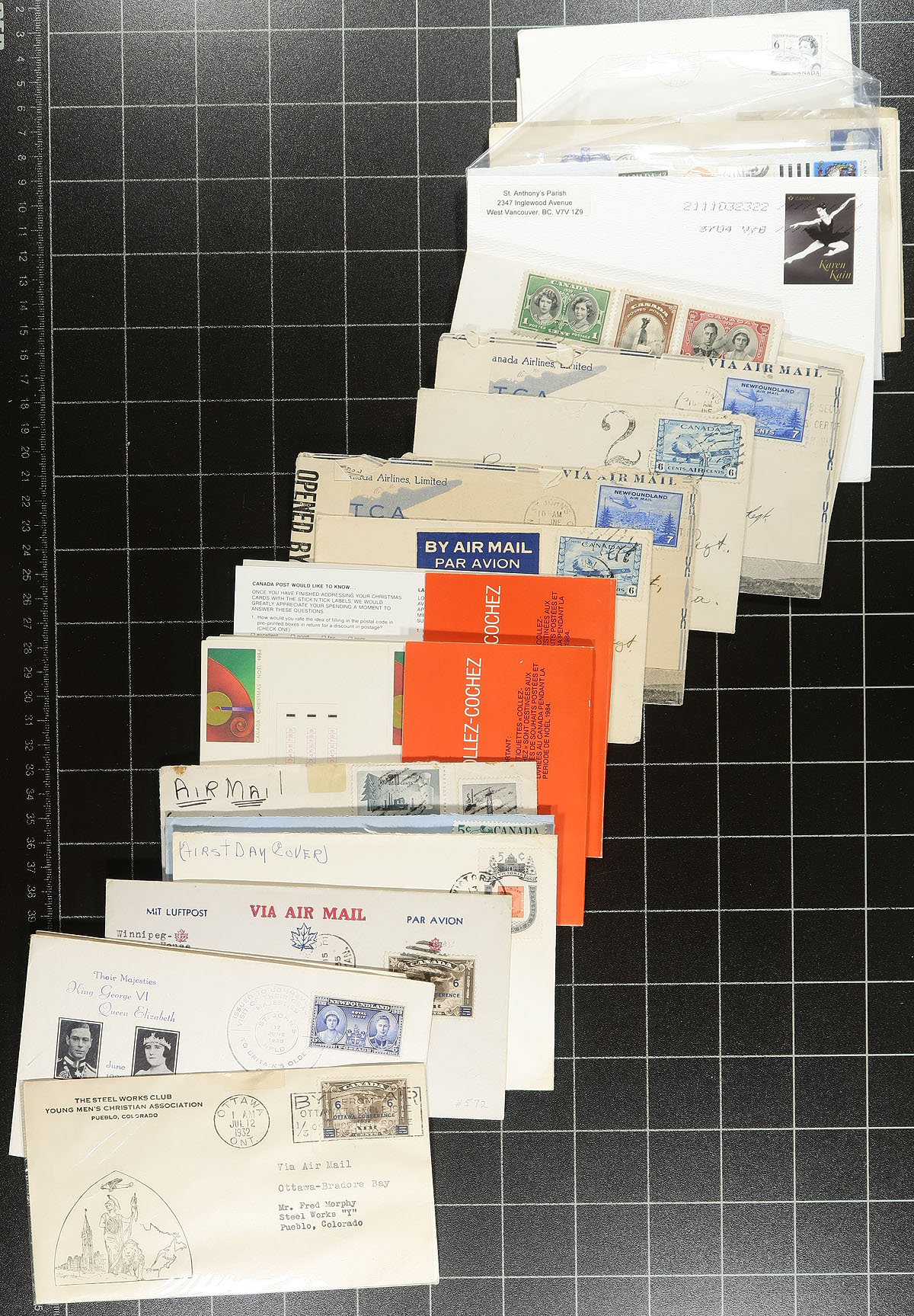Group of a few hundred of covers in a plastic bin, 1900's-2000's. A cursory glance of the lot indicated a wide variety of items within including a few Victorian era items, post cards, postal stationery, first flight covers (including Unitrade #C4 fdc, c.v. $40), postage due, registered mail, cheques with revenue and regular issues, first day covers (including private cachets), corner advertising envelopes, royal train covers, and more, including an 1852 money letter Cumberland C.W. to Kingston, Regiments first day cover (c.v. $125), and other potential finds. Postmark interest includes cds, duplex, POCON, slogan, Barrel, and probably others. An interesting lot for the postal history collector, with condition ranging from mixed to better. Estimate =