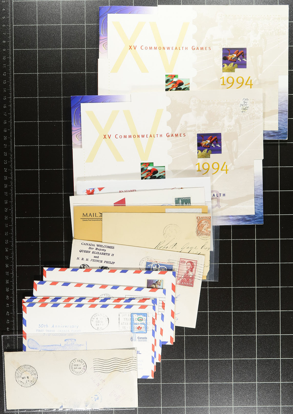 Group of a few hundred of covers in a plastic bin, 1900's-2000's. A cursory glance of the lot indicated a wide variety of items within including a few Victorian era items, post cards, postal stationery, first flight covers (including Unitrade #C4 fdc, c.v. $40), postage due, registered mail, cheques with revenue and regular issues, first day covers (including private cachets), corner advertising envelopes, royal train covers, and more, including an 1852 money letter Cumberland C.W. to Kingston, Regiments first day cover (c.v. $125), and other potential finds. Postmark interest includes cds, duplex, POCON, slogan, Barrel, and probably others. An interesting lot for the postal history collector, with condition ranging from mixed to better. Estimate =