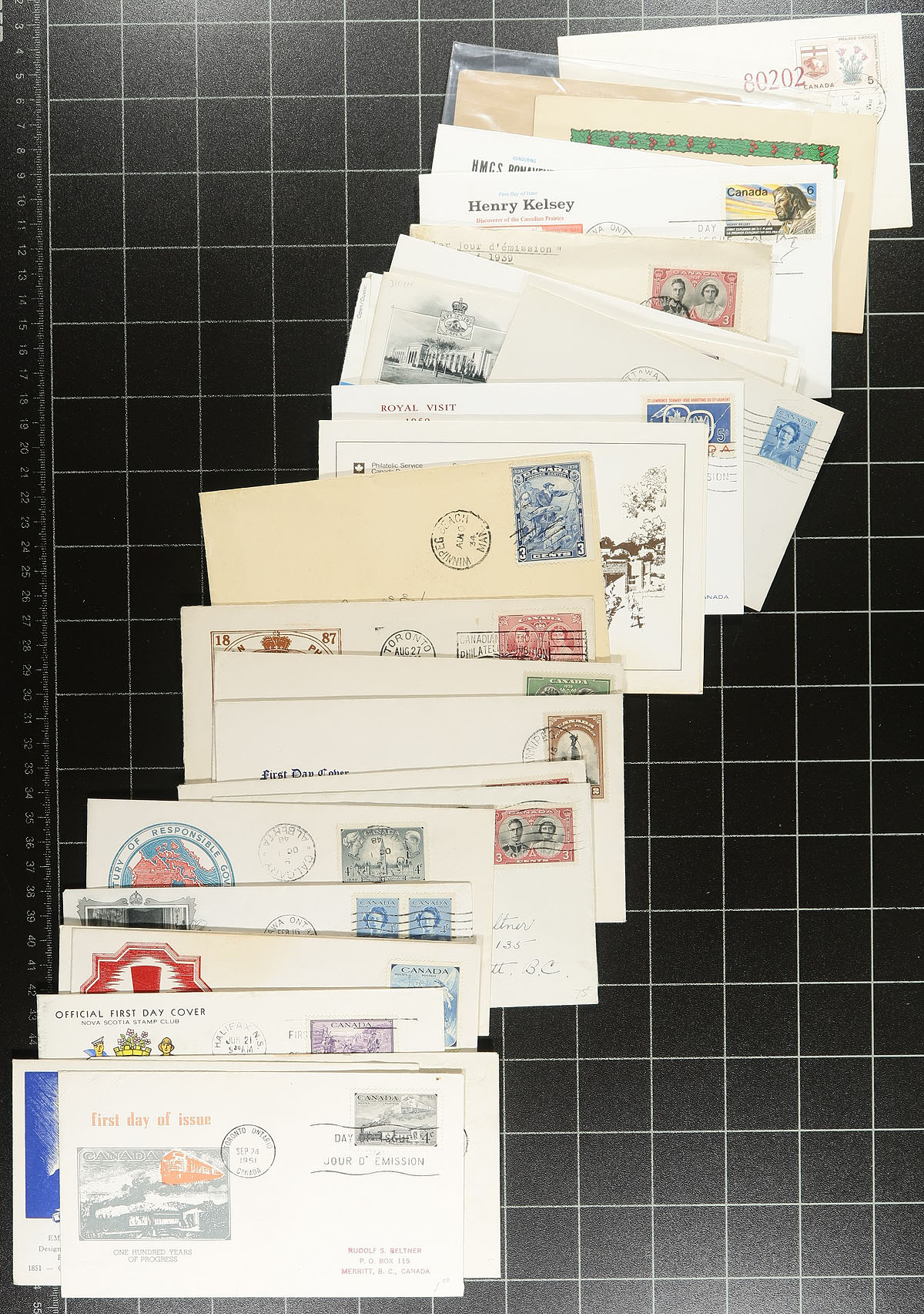 Group of a few hundred of covers in a plastic bin, 1900's-2000's. A cursory glance of the lot indicated a wide variety of items within including a few Victorian era items, post cards, postal stationery, first flight covers (including Unitrade #C4 fdc, c.v. $40), postage due, registered mail, cheques with revenue and regular issues, first day covers (including private cachets), corner advertising envelopes, royal train covers, and more, including an 1852 money letter Cumberland C.W. to Kingston, Regiments first day cover (c.v. $125), and other potential finds. Postmark interest includes cds, duplex, POCON, slogan, Barrel, and probably others. An interesting lot for the postal history collector, with condition ranging from mixed to better. Estimate =