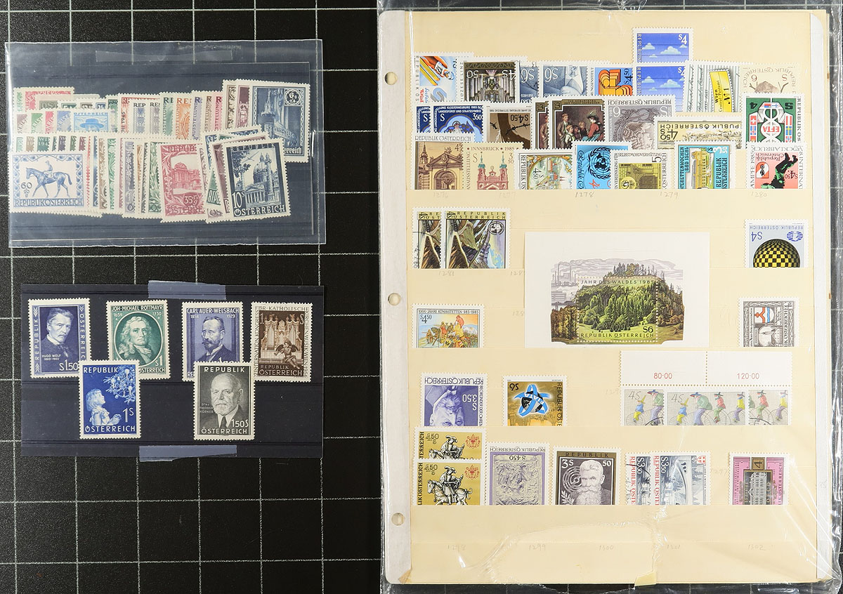 Collection of mint Austria, 1918-1989, containing many hundreds of stamps in several album pages and 102 cards in stock pages. The lot generally ranges from Scott #181/1447, noting singles, sets, souvenir sheets, and back of the book issues, primarily from the 1950's to the 1980's. A spot check indicated a few items cataloguing $10 and up, with owner's 2012 Scott catalogue value for the lot totals US$642.00 ($866.70 CDN), leaving better finds to the dedicated collector. Some duplication, generally up to 3 for some issues, still a nice lot for the worldwide collector, overall fine to very fine. Estimate =