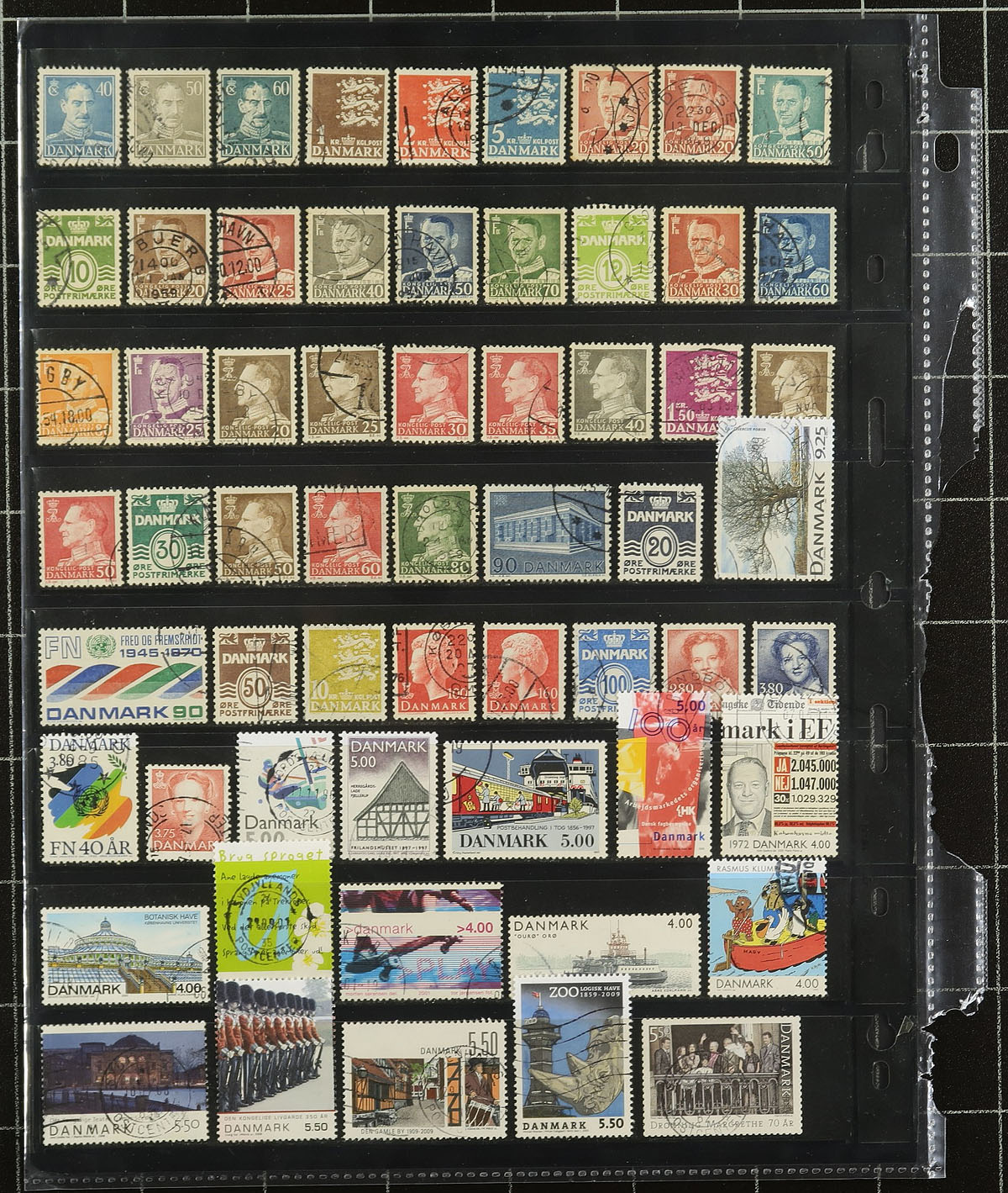 Accumulation of used Denmark, 1864-2011, containing roughly 900 stamps in several album or stock pages. The lot generally ranges from Scott #13/1569, including sets and partial sets and back of the book issues. A cursory check indicated a few better stamps including #s 18-19, 68 ($120), O9, along with singles, sets, and partial sets cataloguing $10 and up. Owner's 2016 Scott catalogue value for the lot totals US$1,144.00 ($1544.40 CDN). A nice lot noting several 'socked on the nose' town postmarks, a few faults with the early stamps, overall fine to very fine. Estimate =
