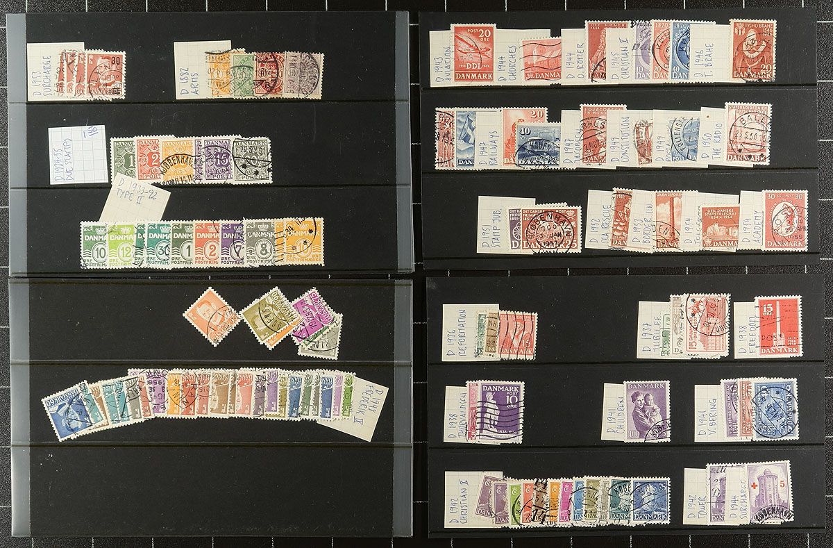 Accumulation of used Denmark, 1864-2011, containing roughly 900 stamps in several album or stock pages. The lot generally ranges from Scott #13/1569, including sets and partial sets and back of the book issues. A cursory check indicated a few better stamps including #s 18-19, 68 ($120), O9, along with singles, sets, and partial sets cataloguing $10 and up. Owner's 2016 Scott catalogue value for the lot totals US$1,144.00 ($1544.40 CDN). A nice lot noting several 'socked on the nose' town postmarks, a few faults with the early stamps, overall fine to very fine. Estimate =