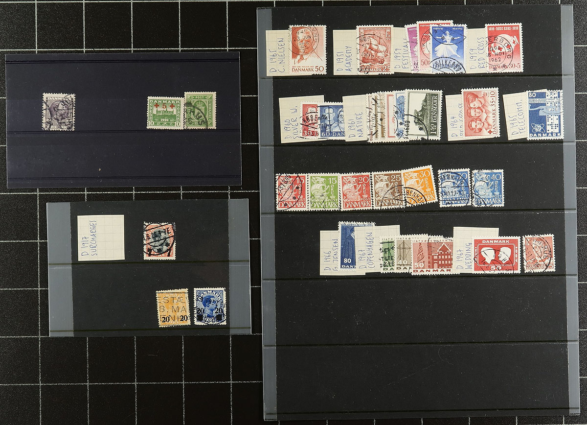 Accumulation of used Denmark, 1864-2011, containing roughly 900 stamps in several album or stock pages. The lot generally ranges from Scott #13/1569, including sets and partial sets and back of the book issues. A cursory check indicated a few better stamps including #s 18-19, 68 ($120), O9, along with singles, sets, and partial sets cataloguing $10 and up. Owner's 2016 Scott catalogue value for the lot totals US$1,144.00 ($1544.40 CDN). A nice lot noting several 'socked on the nose' town postmarks, a few faults with the early stamps, overall fine to very fine. Estimate =