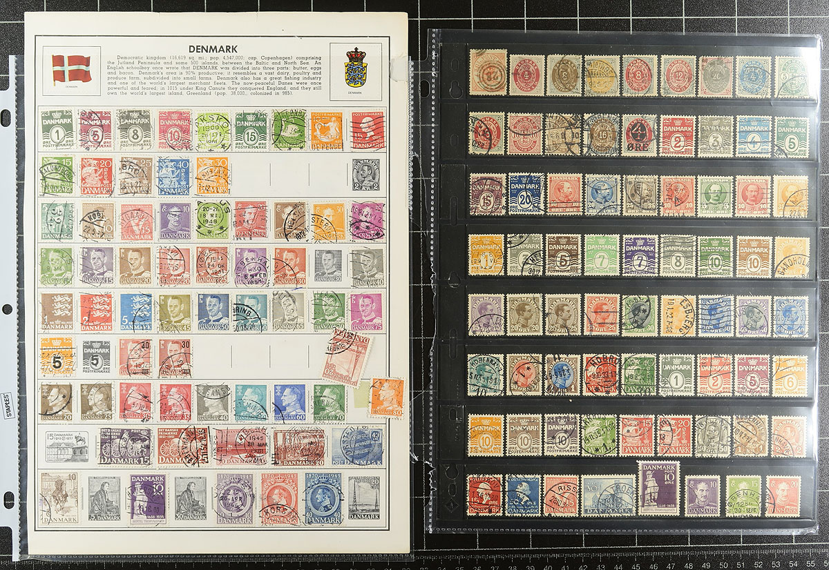 Accumulation of used Denmark, 1864-2011, containing roughly 900 stamps in several album or stock pages. The lot generally ranges from Scott #13/1569, including sets and partial sets and back of the book issues. A cursory check indicated a few better stamps including #s 18-19, 68 ($120), O9, along with singles, sets, and partial sets cataloguing $10 and up. Owner's 2016 Scott catalogue value for the lot totals US$1,144.00 ($1544.40 CDN). A nice lot noting several 'socked on the nose' town postmarks, a few faults with the early stamps, overall fine to very fine. Estimate =