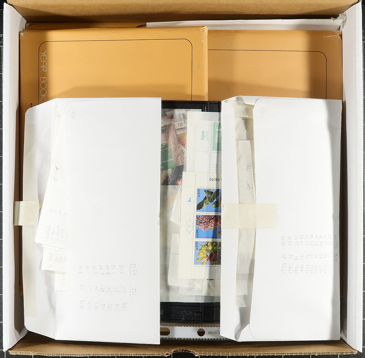 Accumulation of never hinged Israel stamps, 1971-2010, containing roughly 1,000 stamps in a variety of formats. The lot generally ranges from Scott #436/1805, almost all with tabs, noting stamps and souvenir sheets in well organized envelopes, a few stock pages, and annual collections from 1981-1982, 1986-1987, 1990-1992. Owner's 2017 Scott catalogue value for the collection totals US$1,089.00 ($1470.15 CDN). A nice clean lot for all collectors and dealers looking for stock, very fine. Estimate =