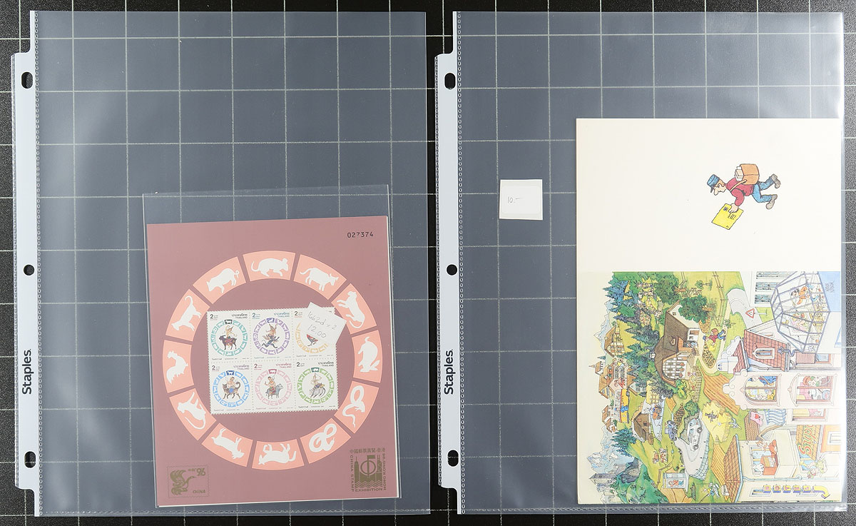 Nice clean group of worldwide stamps and souvenir sheets in plastic page protectors housed in a binder. The lot has 50 or so items including souvenir sheets, pairs, sheetlets, booklets, etc., generally ranging from the 1980's onwards, noting representation from British Commonwealth areas and a few other regions. The owner has identified each item using Scott numbers and what appears to be current catalogue values with the lot, noting many items cataloguing $10 and up each, with a total catalogue value at $508.00. A nice clean lot for topical and thematic collectors and dealers alike. Estimate =