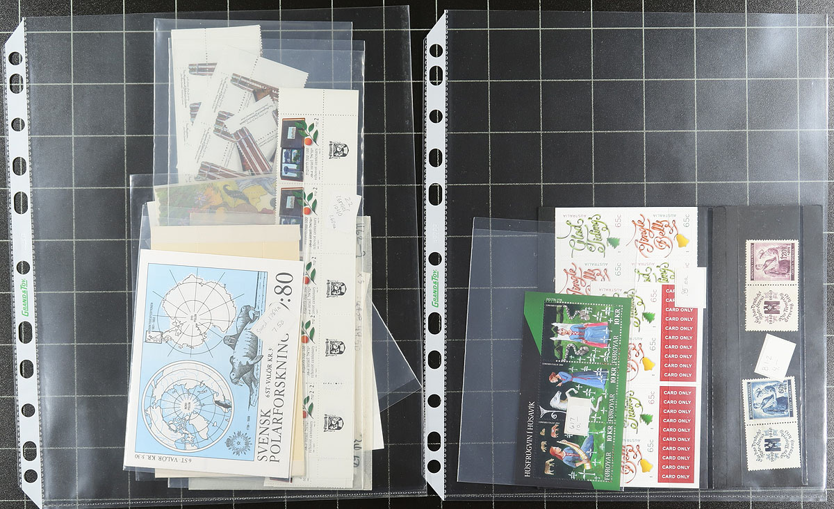 Nice clean group of worldwide stamps and souvenir sheets in plastic page protectors housed in a binder. The lot has 50 or so items including souvenir sheets, pairs, sheetlets, booklets, etc., generally ranging from the 1980's onwards, noting representation from British Commonwealth areas and a few other regions. The owner has identified each item using Scott numbers and what appears to be current catalogue values with the lot, noting many items cataloguing $10 and up each, with a total catalogue value at $508.00. A nice clean lot for topical and thematic collectors and dealers alike. Estimate =