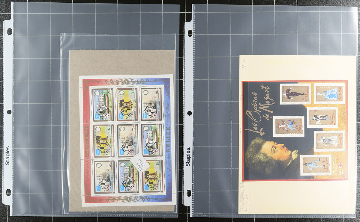 Nice clean group of worldwide stamps and souvenir sheets in plastic page protectors housed in a binder. The lot has 50 or so items including souvenir sheets, pairs, sheetlets, booklets, etc., generally ranging from the 1980's onwards, noting representation from British Commonwealth areas and a few other regions. The owner has identified each item using Scott numbers and what appears to be current catalogue values with the lot, noting many items cataloguing $10 and up each, with a total catalogue value at $508.00. A nice clean lot for topical and thematic collectors and dealers alike. Estimate =
