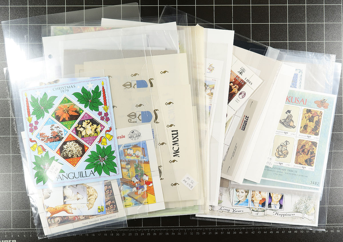 Nice group of primarily never hinged worldwide souvenir sheets, generally ranging from the 1950's to the 2000's. All of the items (roughly 40 different), are in plastic protectors and have been identified by the owner using Scott numbers and current catalogue values, noting several items cataloguing $10 and up each, including Mexico #234a (mh, c.v. $70). Owner's current catalogue value for the lot totals US$620.00. A lovely lot for topical and thematic collectors as we encountered many suitable subjects, and for dealers looking for stock, overall very fine. Estimate =