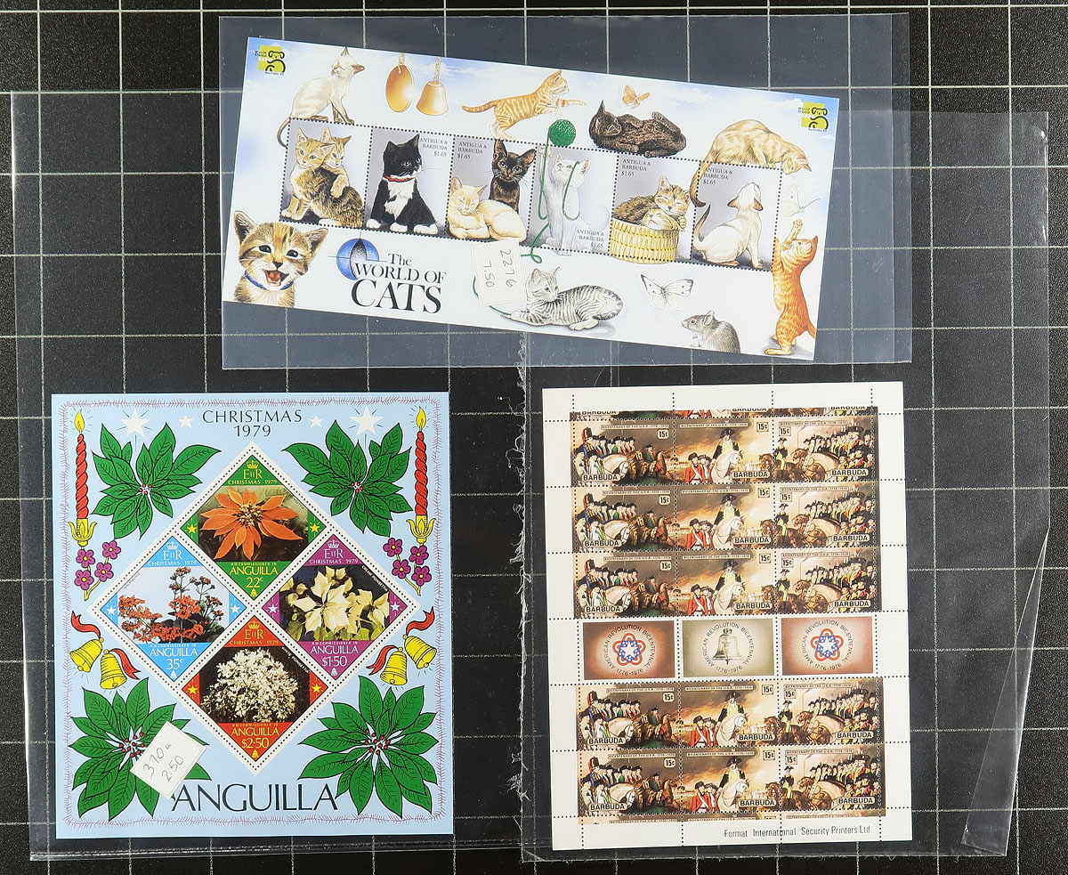 Nice group of primarily never hinged worldwide souvenir sheets, generally ranging from the 1950's to the 2000's. All of the items (roughly 40 different), are in plastic protectors and have been identified by the owner using Scott numbers and current catalogue values, noting several items cataloguing $10 and up each, including Mexico #234a (mh, c.v. $70). Owner's current catalogue value for the lot totals US$620.00. A lovely lot for topical and thematic collectors as we encountered many suitable subjects, and for dealers looking for stock, overall very fine. Estimate =