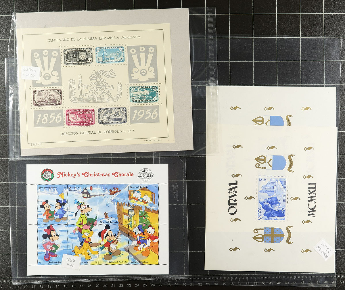 Nice group of primarily never hinged worldwide souvenir sheets, generally ranging from the 1950's to the 2000's. All of the items (roughly 40 different), are in plastic protectors and have been identified by the owner using Scott numbers and current catalogue values, noting several items cataloguing $10 and up each, including Mexico #234a (mh, c.v. $70). Owner's current catalogue value for the lot totals US$620.00. A lovely lot for topical and thematic collectors as we encountered many suitable subjects, and for dealers looking for stock, overall very fine. Estimate =