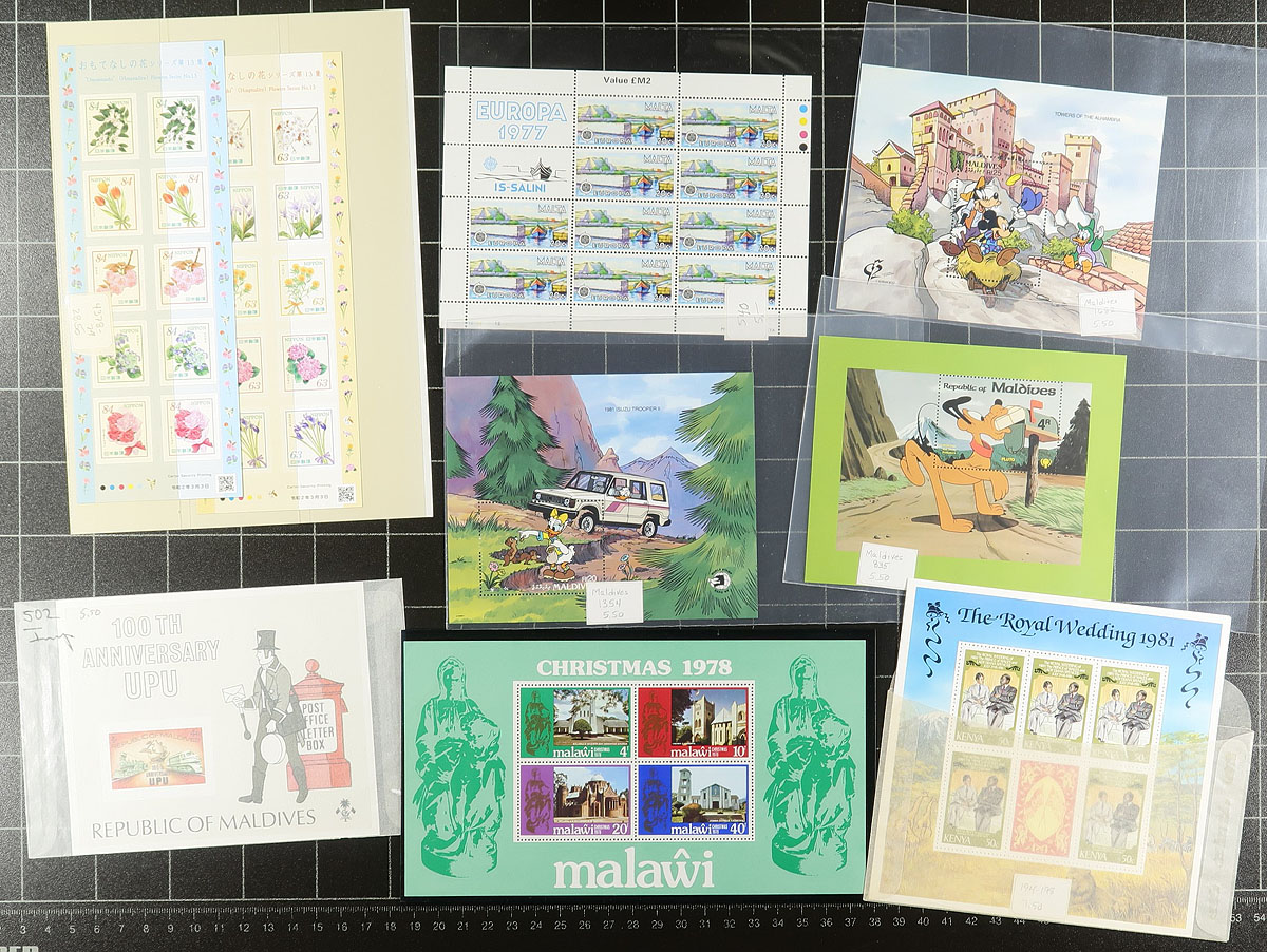 Nice group of primarily never hinged worldwide souvenir sheets, generally ranging from the 1950's to the 2000's. All of the items (roughly 40 different), are in plastic protectors and have been identified by the owner using Scott numbers and current catalogue values, noting several items cataloguing $10 and up each, including Mexico #234a (mh, c.v. $70). Owner's current catalogue value for the lot totals US$620.00. A lovely lot for topical and thematic collectors as we encountered many suitable subjects, and for dealers looking for stock, overall very fine. Estimate =