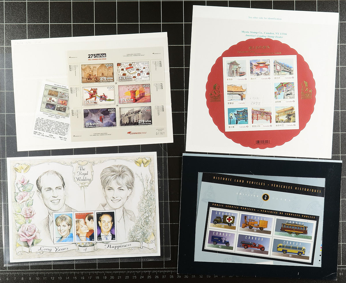 Nice group of primarily never hinged worldwide souvenir sheets, generally ranging from the 1950's to the 2000's. All of the items (roughly 40 different), are in plastic protectors and have been identified by the owner using Scott numbers and current catalogue values, noting several items cataloguing $10 and up each, including Mexico #234a (mh, c.v. $70). Owner's current catalogue value for the lot totals US$620.00. A lovely lot for topical and thematic collectors as we encountered many suitable subjects, and for dealers looking for stock, overall very fine. Estimate =