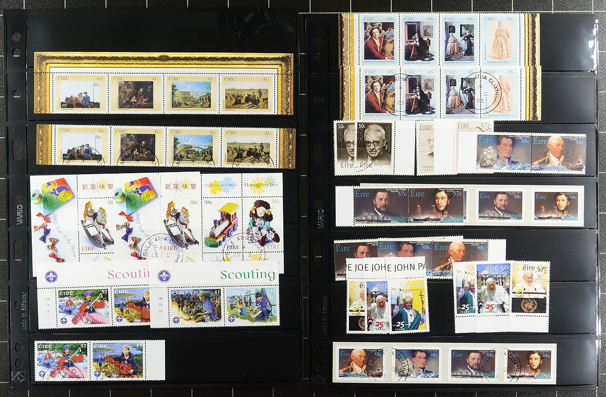 Lovely group of never hinged and used Ireland sets, 2000-2003, containing a few hundred stamps in 5 double sided Vario stock pages. The lot ranges from Scott #1238/1521, typically with a never hinged set and a used set for each issue, along with a few souvenir sheets, coils, etc., noting items cataloguing $5 to $10 each. Ideal for all collectors and dealers alike. A nice clean lot with all pages photographed online. 2026 Scott US$434.00 =
