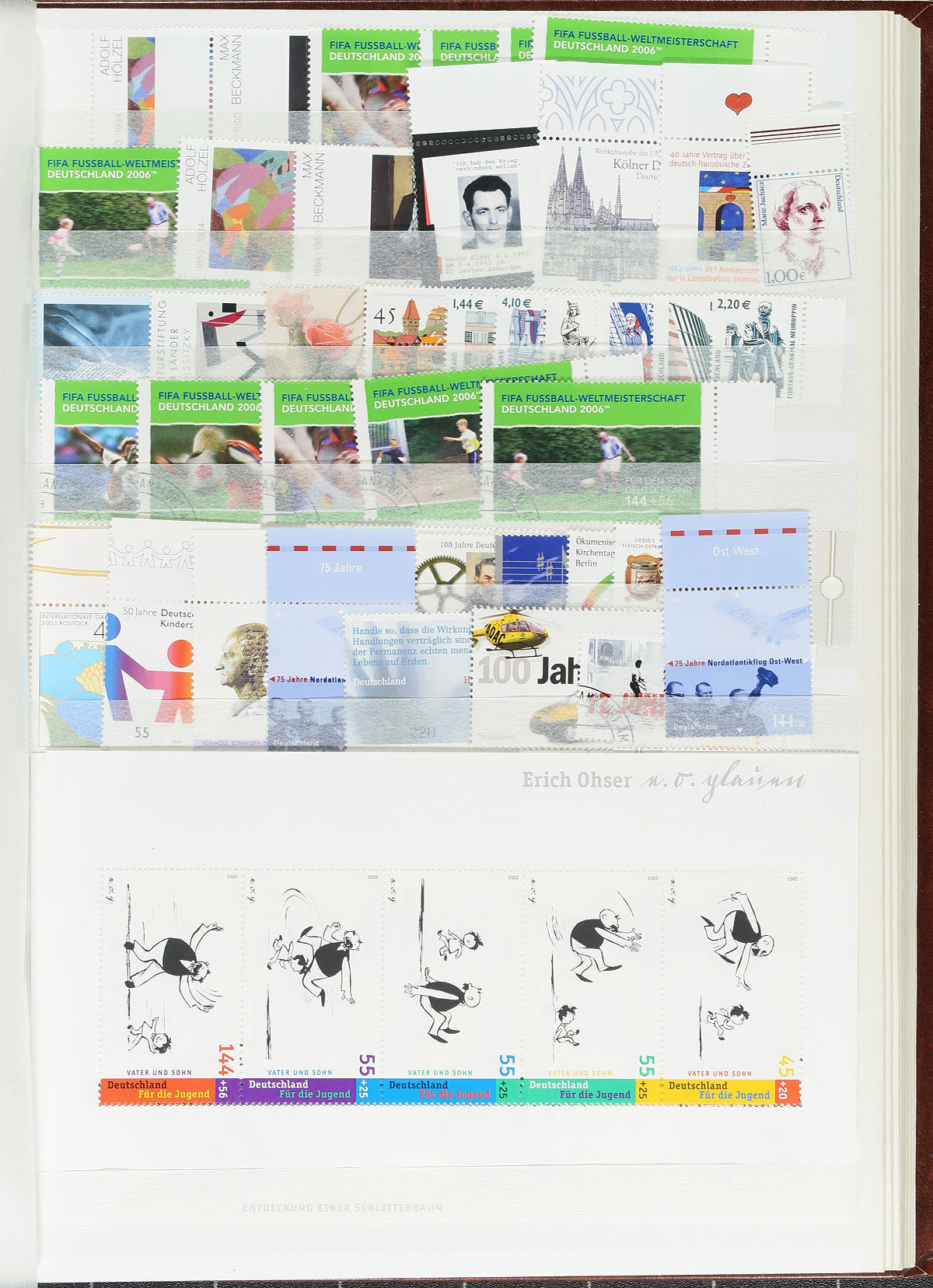 Comprehensive never hinged and used collection of Germany, 1999-2003, containing roughly 1,000 stamps in two stockbooks. This fairly well organized collection generally ranges from Scott #2026/2269, with an attempt to have a mint and used example of each issue (post office cto cancels), including hundreds of semi-postal stamps, sets, souvenir sheets, strips, and more. A spot check indicated sets and other items cataloguing $10 and up, with the likelihood of a few hundred Euro's in usable face value postage. A lovely lot for collectors and dealers alike and should be well worth our estimate. Online photos show a sampling. Estimate =
