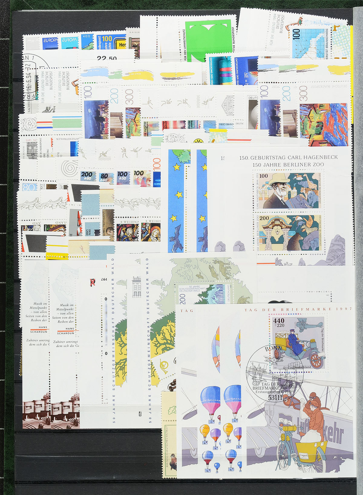 Comprehensive never hinged and used collection of Germany, 1999-2003, containing roughly 1,000 stamps in two stockbooks. This fairly well organized collection generally ranges from Scott #2026/2269, with an attempt to have a mint and used example of each issue (post office cto cancels), including hundreds of semi-postal stamps, sets, souvenir sheets, strips, and more. A spot check indicated sets and other items cataloguing $10 and up, with the likelihood of a few hundred Euro's in usable face value postage. A lovely lot for collectors and dealers alike and should be well worth our estimate. Online photos show a sampling. Estimate =