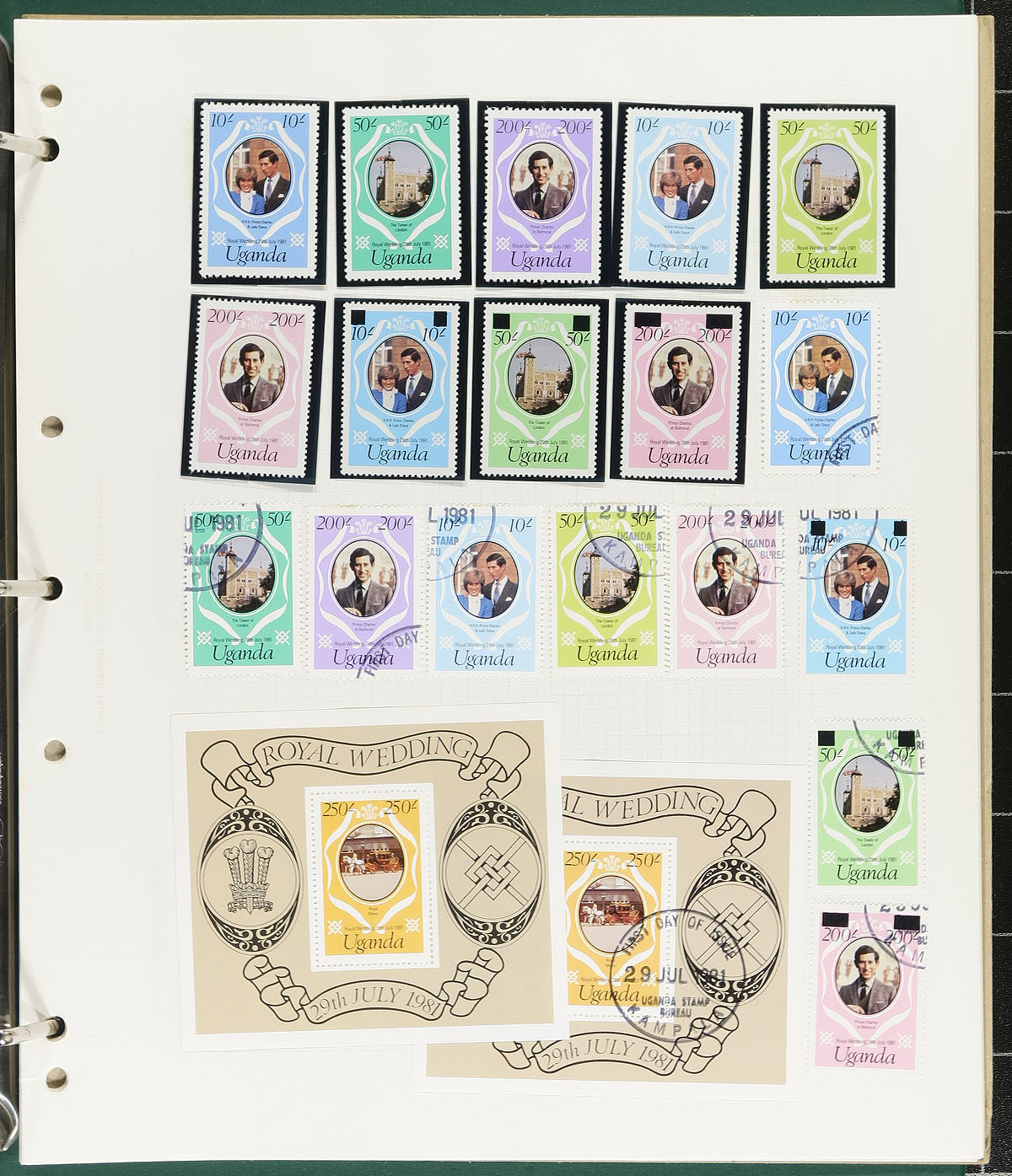 Lovely group of British Commonwealth thematic collections in 7 albums. This is really more of a comprehensive collection containing several hundreds of items, as the owner tried to get a mint and a used example of each issue, noting singles, sets, and souvenir sheets, along with some booklets and a few covers. The lot includes a homemade album containing the 1981 Royal Wedding with material in mostly hingeless mounts, along with 1972 Silver Wedding, 1973 Royal Wedding, 1978 Coronation Anniversary (2 volumes), 1977 Silver Jubilee (2 volumes). A nice lot ideal for collectors and dealers alike. Estimate =