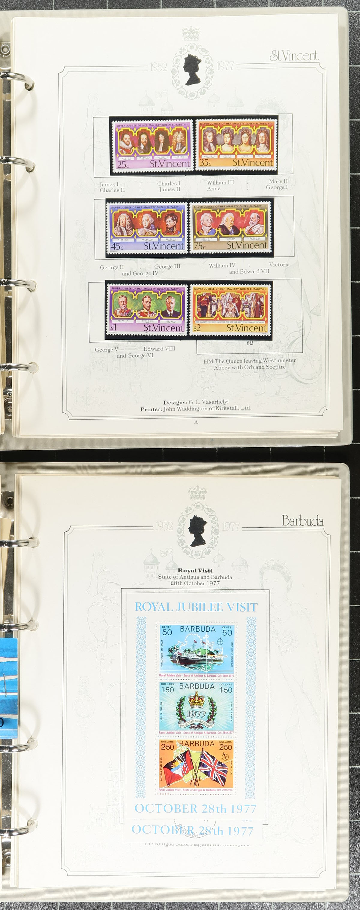 Lovely group of British Commonwealth thematic collections in 7 albums. This is really more of a comprehensive collection containing several hundreds of items, as the owner tried to get a mint and a used example of each issue, noting singles, sets, and souvenir sheets, along with some booklets and a few covers. The lot includes a homemade album containing the 1981 Royal Wedding with material in mostly hingeless mounts, along with 1972 Silver Wedding, 1973 Royal Wedding, 1978 Coronation Anniversary (2 volumes), 1977 Silver Jubilee (2 volumes). A nice lot ideal for collectors and dealers alike. Estimate =
