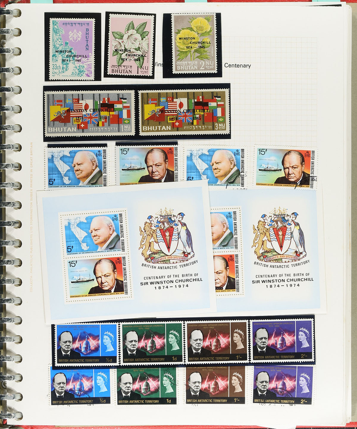 Nice group of Thematic collections, including a comprehensive Winston Churchill collection contains many hundreds of items mostly in hingeless mount on several homemade pages. This collector tried to get a mint and used example from the 1966 Churchill Memorial Omnibus issues (264 stamps in total, c.v. $329, complete except for New Hebrides, French), along with mint and used singles, sets, and souvenir sheets from the 1974 Centenary of Churchill's Birth. The lot also includes a Lyndhurst album containing a few hundred items, primarily used sets and souvenir sheets of the 100th Anniversary of the Death of Sir Rowland Hill, 1879-1979; and two volumes of WWF material, still in original packaging containing album pages, stamps, first day covers, maximum cards, and plastic sleeves for the material (from about 10 issuing regions). A lovely lot for thematic or topical collector. Estimate =