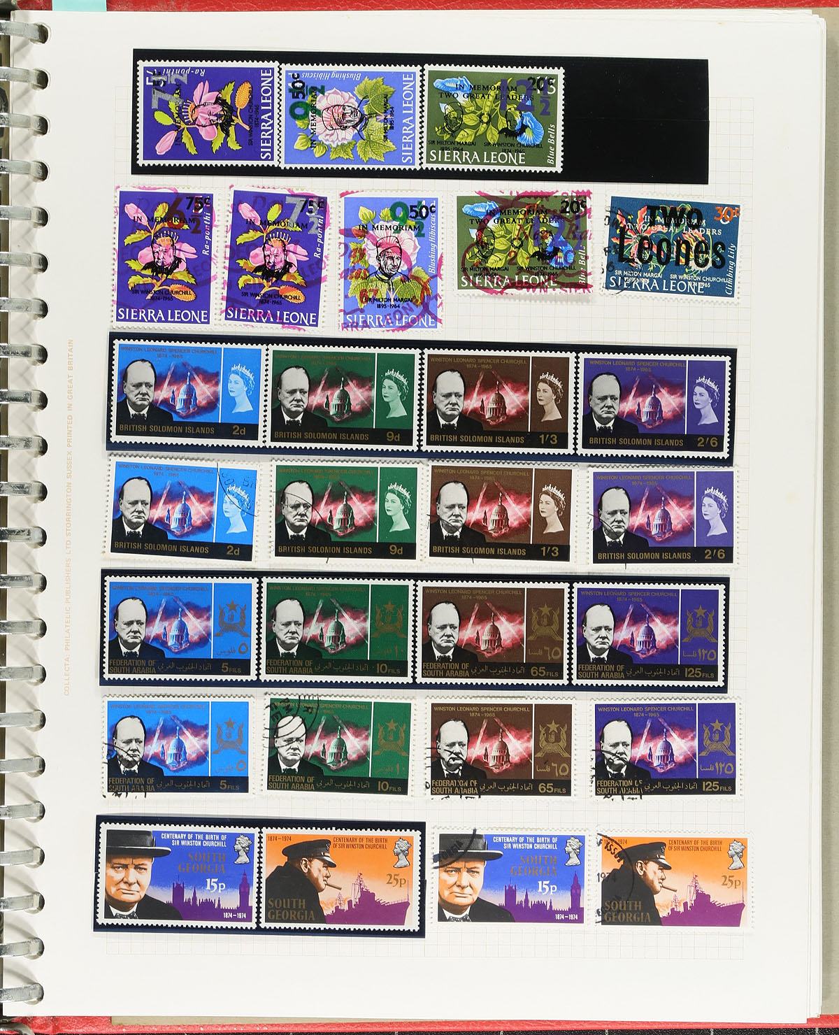 Nice group of Thematic collections, including a comprehensive Winston Churchill collection contains many hundreds of items mostly in hingeless mount on several homemade pages. This collector tried to get a mint and used example from the 1966 Churchill Memorial Omnibus issues (264 stamps in total, c.v. $329, complete except for New Hebrides, French), along with mint and used singles, sets, and souvenir sheets from the 1974 Centenary of Churchill's Birth. The lot also includes a Lyndhurst album containing a few hundred items, primarily used sets and souvenir sheets of the 100th Anniversary of the Death of Sir Rowland Hill, 1879-1979; and two volumes of WWF material, still in original packaging containing album pages, stamps, first day covers, maximum cards, and plastic sleeves for the material (from about 10 issuing regions). A lovely lot for thematic or topical collector. Estimate =