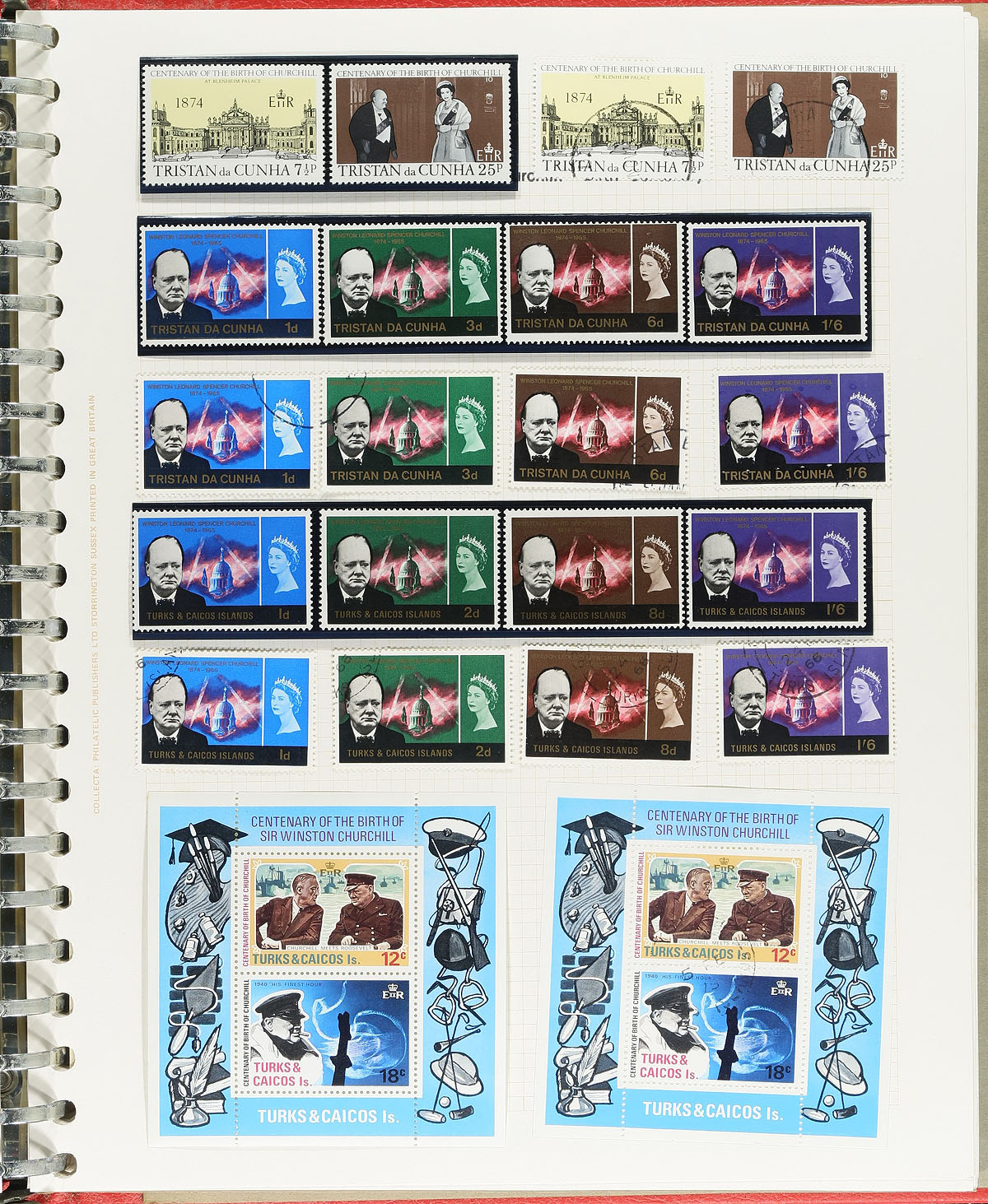 Nice group of Thematic collections, including a comprehensive Winston Churchill collection contains many hundreds of items mostly in hingeless mount on several homemade pages. This collector tried to get a mint and used example from the 1966 Churchill Memorial Omnibus issues (264 stamps in total, c.v. $329, complete except for New Hebrides, French), along with mint and used singles, sets, and souvenir sheets from the 1974 Centenary of Churchill's Birth. The lot also includes a Lyndhurst album containing a few hundred items, primarily used sets and souvenir sheets of the 100th Anniversary of the Death of Sir Rowland Hill, 1879-1979; and two volumes of WWF material, still in original packaging containing album pages, stamps, first day covers, maximum cards, and plastic sleeves for the material (from about 10 issuing regions). A lovely lot for thematic or topical collector. Estimate =