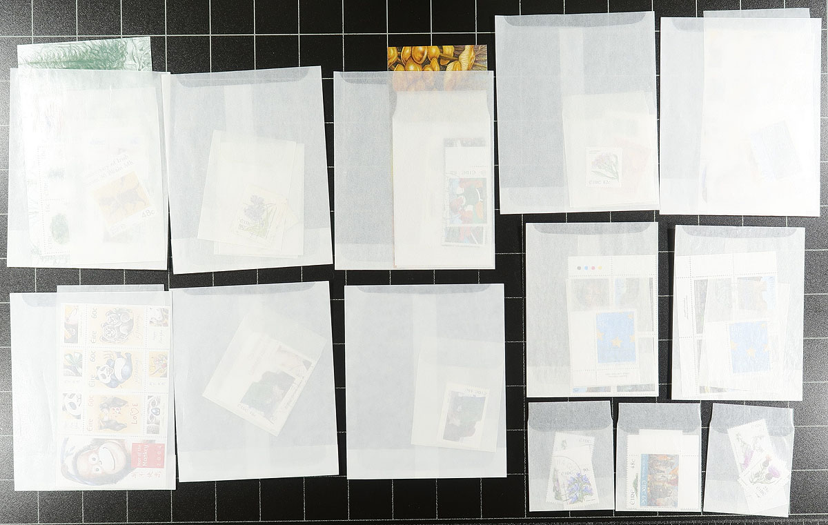 Assortment of mint and used Ireland in many glassines and a few albums pages, 2005-2008. The lot contains many hundreds of stamps in glassines, appearing to have a mint and used example for each issue, generally ranging from 2005 to 2008. The lot also includes a few album pages with stamps hinged onto pages from the late 1980's. Presumably, the material in glassines was to be organized into pages or a stockbook, still, a spot check indicated some sets cataloguing $10 and up. A nice lot with better finds possible for collectors and dealers alike. Estimate =