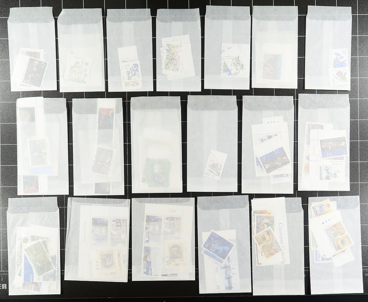 Assortment of mint and used Ireland in many glassines and a few albums pages, 2005-2008. The lot contains many hundreds of stamps in glassines, appearing to have a mint and used example for each issue, generally ranging from 2005 to 2008. The lot also includes a few album pages with stamps hinged onto pages from the late 1980's. Presumably, the material in glassines was to be organized into pages or a stockbook, still, a spot check indicated some sets cataloguing $10 and up. A nice lot with better finds possible for collectors and dealers alike. Estimate =