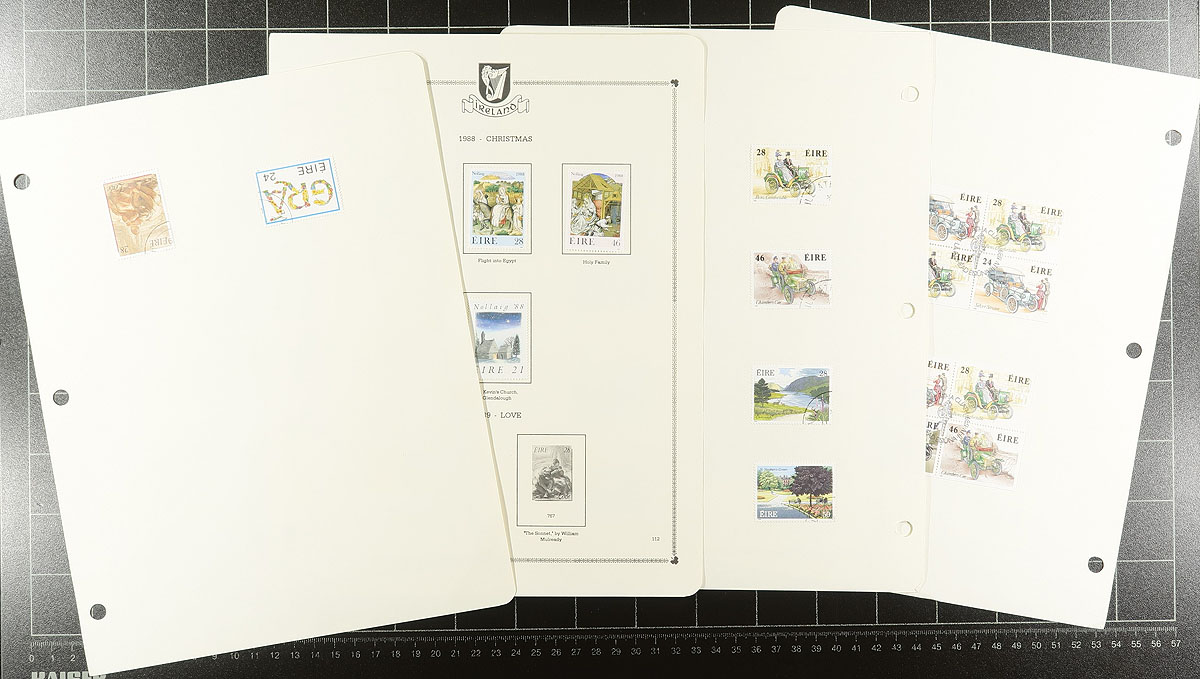 Assortment of mint and used Ireland in many glassines and a few albums pages, 2005-2008. The lot contains many hundreds of stamps in glassines, appearing to have a mint and used example for each issue, generally ranging from 2005 to 2008. The lot also includes a few album pages with stamps hinged onto pages from the late 1980's. Presumably, the material in glassines was to be organized into pages or a stockbook, still, a spot check indicated some sets cataloguing $10 and up. A nice lot with better finds possible for collectors and dealers alike. Estimate =