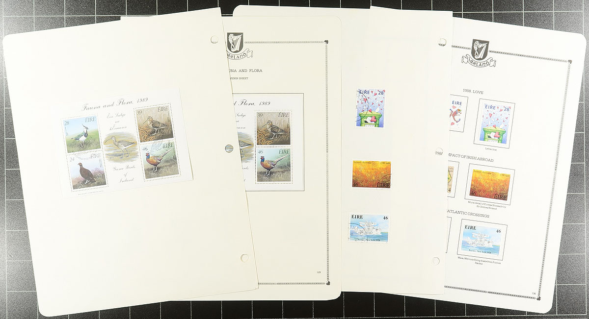 Assortment of mint and used Ireland in many glassines and a few albums pages, 2005-2008. The lot contains many hundreds of stamps in glassines, appearing to have a mint and used example for each issue, generally ranging from 2005 to 2008. The lot also includes a few album pages with stamps hinged onto pages from the late 1980's. Presumably, the material in glassines was to be organized into pages or a stockbook, still, a spot check indicated some sets cataloguing $10 and up. A nice lot with better finds possible for collectors and dealers alike. Estimate =