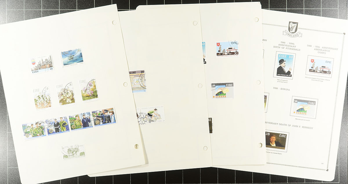 Assortment of mint and used Ireland in many glassines and a few albums pages, 2005-2008. The lot contains many hundreds of stamps in glassines, appearing to have a mint and used example for each issue, generally ranging from 2005 to 2008. The lot also includes a few album pages with stamps hinged onto pages from the late 1980's. Presumably, the material in glassines was to be organized into pages or a stockbook, still, a spot check indicated some sets cataloguing $10 and up. A nice lot with better finds possible for collectors and dealers alike. Estimate =