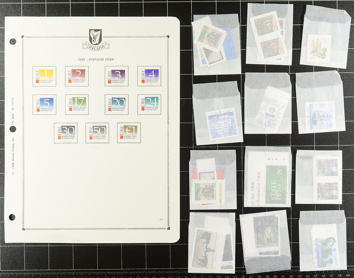 Assortment of mint and used Ireland in many glassines and a few albums pages, 2005-2008. The lot contains many hundreds of stamps in glassines, appearing to have a mint and used example for each issue, generally ranging from 2005 to 2008. The lot also includes a few album pages with stamps hinged onto pages from the late 1980's. Presumably, the material in glassines was to be organized into pages or a stockbook, still, a spot check indicated some sets cataloguing $10 and up. A nice lot with better finds possible for collectors and dealers alike. Estimate =