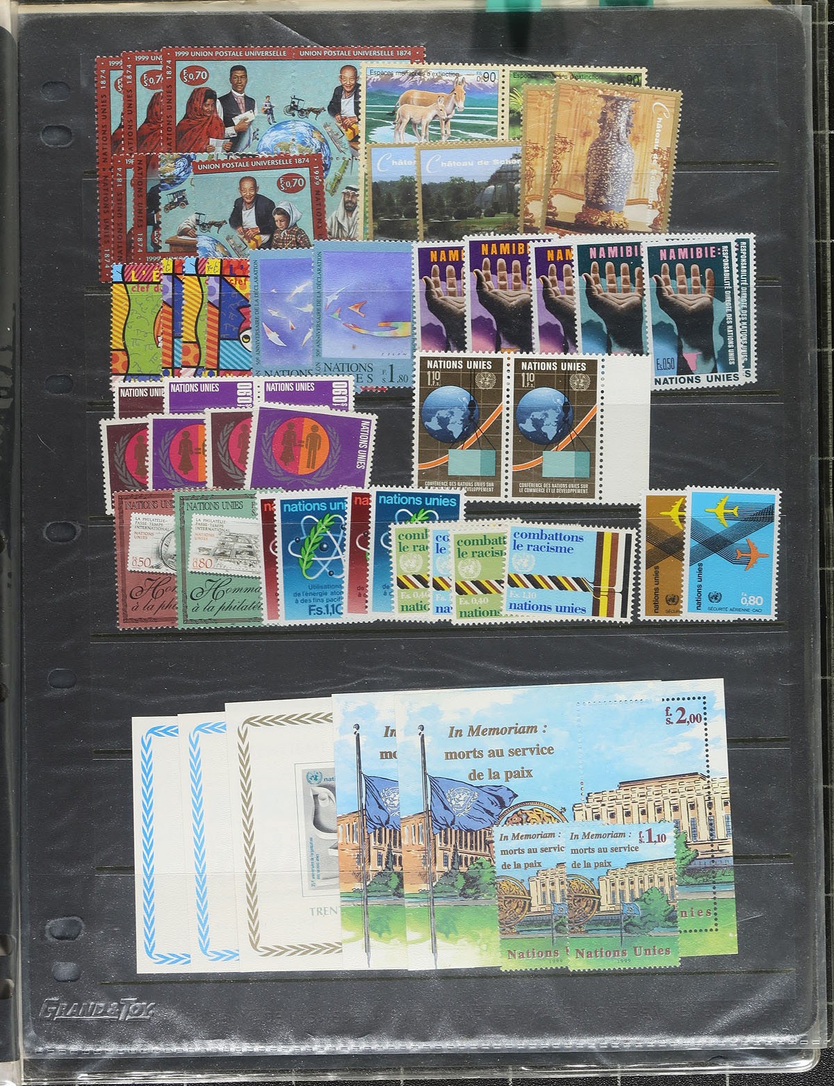 Accumulation of never hinged United Nations, from all three offices, 1950's-2000's, containing many hundreds of stamps in a variety of formats. A cursory check indicated several sets, souvenir sheets and sheetlets, annual and thematic collections, and more including Endangered Species collections, Oceans sheetlets, Rain Forests, etc. Owner's 2011 Scott catalogue value for a portion of the lot totals $586.00, leaving finds for collectors and dealers alike. A beautiful lot for thematic and topical collectors as we encountered many suitable subjects. Clean and very fine. Estimate =