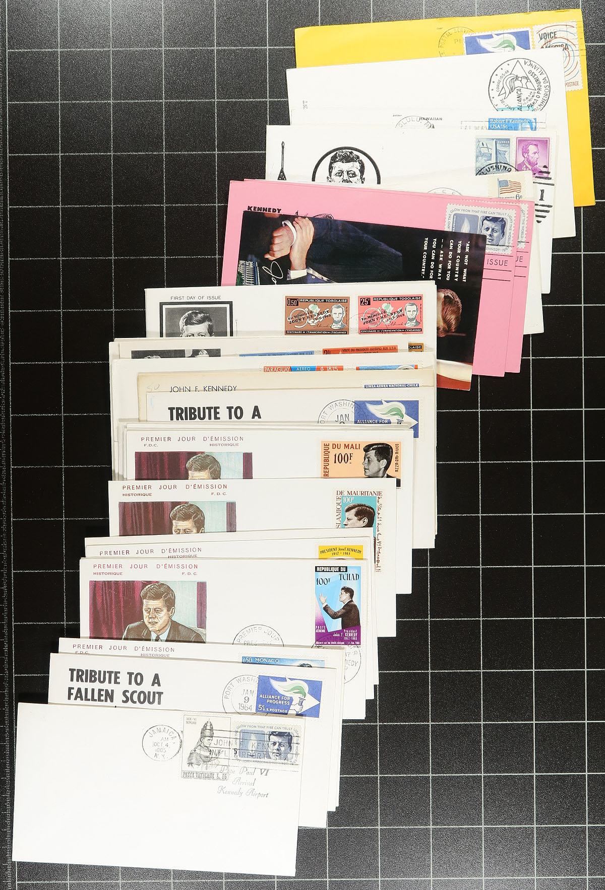 Interesting collection of roughly 175 covers relating to John F. Kennedy, loose in a box. We note a good variety of items primarily first day covers (noting several colourful worldwide cachets), stamp frankings depicting the image of Kennedy, noting singles, sets, and souvenir sheets, along with first flight covers, postal stationery, postcards, signed covers, a few commercial covers, photos, and more. A nice lot and a popular subject for the topical or thematic collector. A few faults with a few of the covers, noting a few bent corners, overall fine to very fine. Estimate =