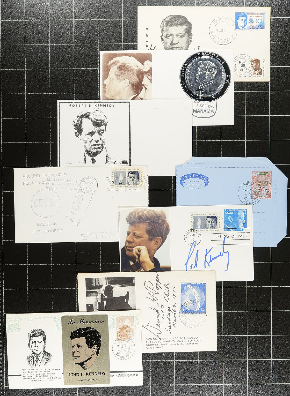 Interesting collection of roughly 175 covers relating to John F. Kennedy, loose in a box. We note a good variety of items primarily first day covers (noting several colourful worldwide cachets), stamp frankings depicting the image of Kennedy, noting singles, sets, and souvenir sheets, along with first flight covers, postal stationery, postcards, signed covers, a few commercial covers, photos, and more. A nice lot and a popular subject for the topical or thematic collector. A few faults with a few of the covers, noting a few bent corners, overall fine to very fine. Estimate =