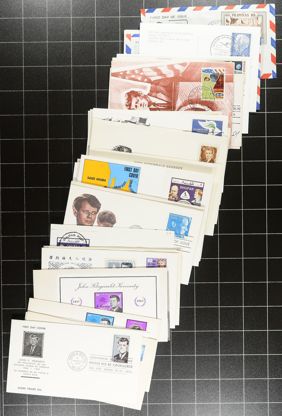 Interesting collection of roughly 175 covers relating to John F. Kennedy, loose in a box. We note a good variety of items primarily first day covers (noting several colourful worldwide cachets), stamp frankings depicting the image of Kennedy, noting singles, sets, and souvenir sheets, along with first flight covers, postal stationery, postcards, signed covers, a few commercial covers, photos, and more. A nice lot and a popular subject for the topical or thematic collector. A few faults with a few of the covers, noting a few bent corners, overall fine to very fine. Estimate =