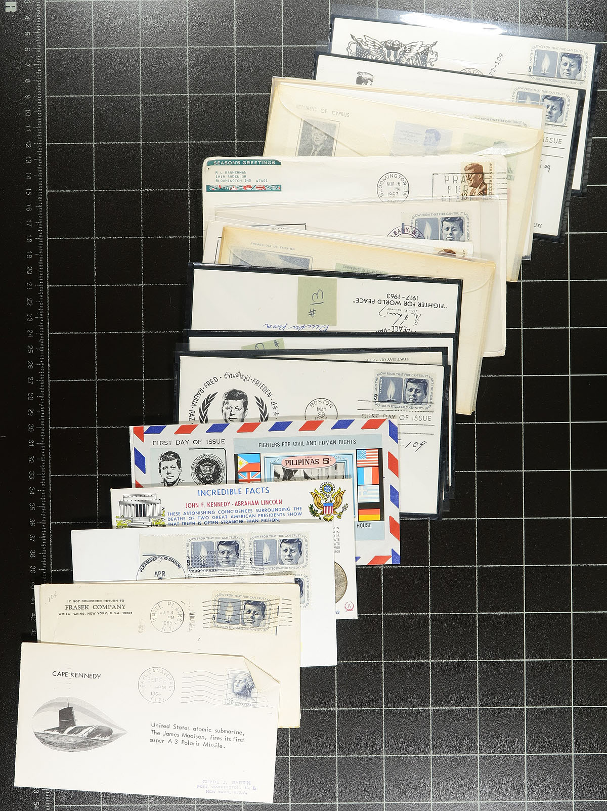 Interesting collection of roughly 175 covers relating to John F. Kennedy, loose in a box. We note a good variety of items primarily first day covers (noting several colourful worldwide cachets), stamp frankings depicting the image of Kennedy, noting singles, sets, and souvenir sheets, along with first flight covers, postal stationery, postcards, signed covers, a few commercial covers, photos, and more. A nice lot and a popular subject for the topical or thematic collector. A few faults with a few of the covers, noting a few bent corners, overall fine to very fine. Estimate =