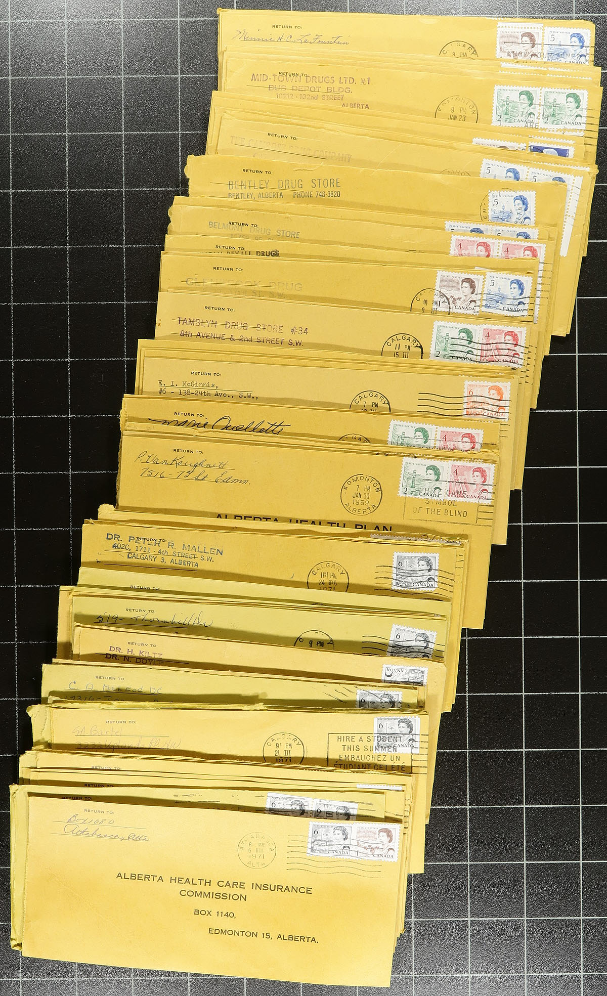 QEII Centennial Postal History. Interesting group of roughly 425 covers all franked with Centennial issues and Alberta town postmarks, 1969-1971. The lot is a correspondence to the Alberta Health Care Insurance Commission, noting various combinations of Centennial rates and frankings, including 1c uprated with non Centennial issues, solo Centennial frankings, combination Centennial frankings (1c to 10c stamps), coil usages, and more. The bonus of the lot is about 98% of the covers have Alberta town postmarks, mostly from Calgary and Edmonton, but did spot about 50 different towns including Warburg, Coronation, Vegreville, Caroline, Barrhead, and more, noting slogan, machine, cds, and a few others postmark types. A nice lot for the postmark or Centennial collector, as we have not checked for varieties, taggings, etc. A few faults with some of the covers as is the nature of commercial mail. Estimate =