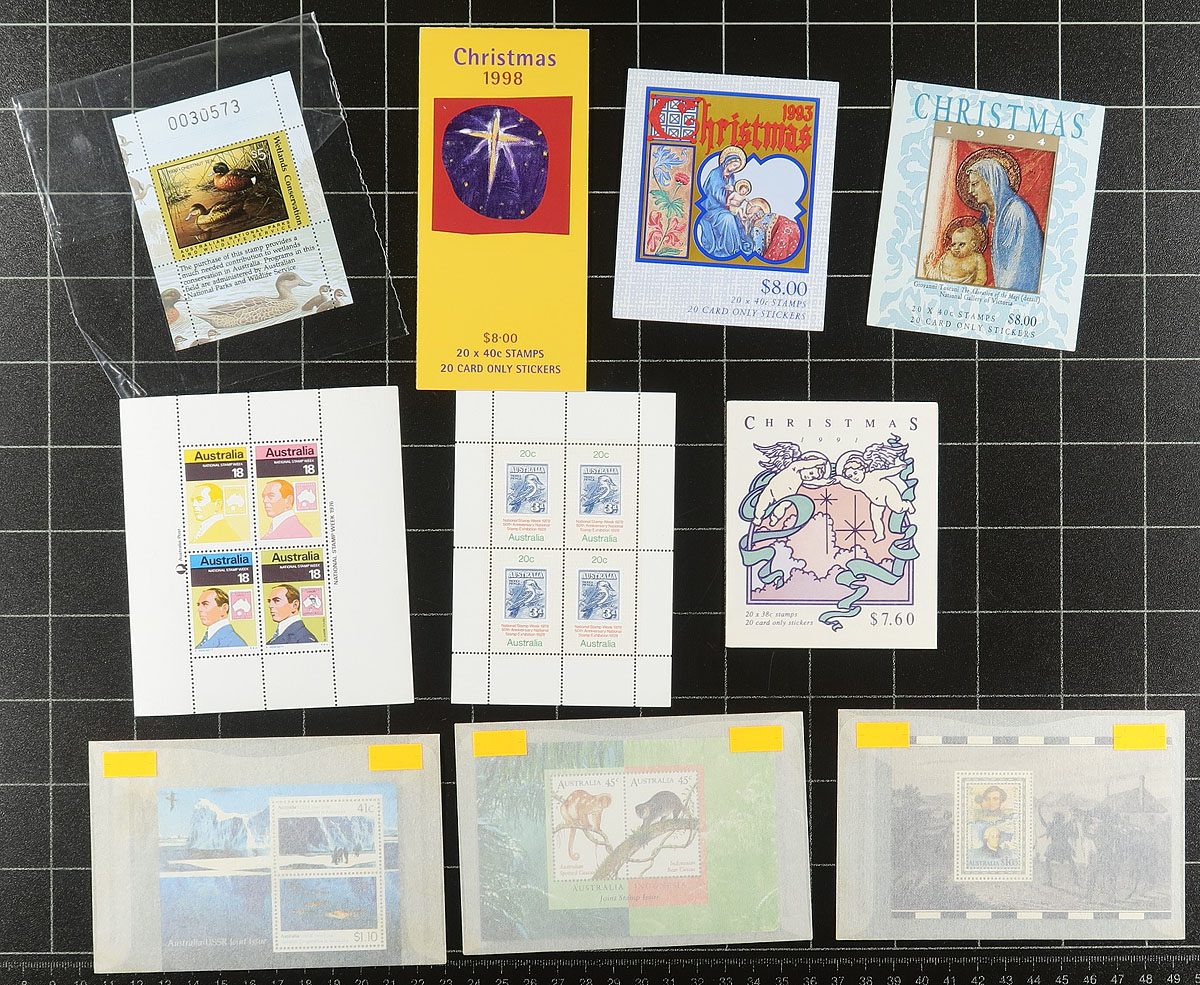 Accumulation of never hinged material, 1970's-1990's, containing a nice variety of items. We note roughly 80 presentation packs (appears to have little duplication), sets and a few souvenir sheets in glassines, stock and album pages, a few booklets, along with a few duck and conversation stamps. A spot check indicated some material cataloguing $10 and up, with face value alone totaling AUD$252.00. A lovely lot, especially for thematic and topical collectors, clean and very fine. Estimate =