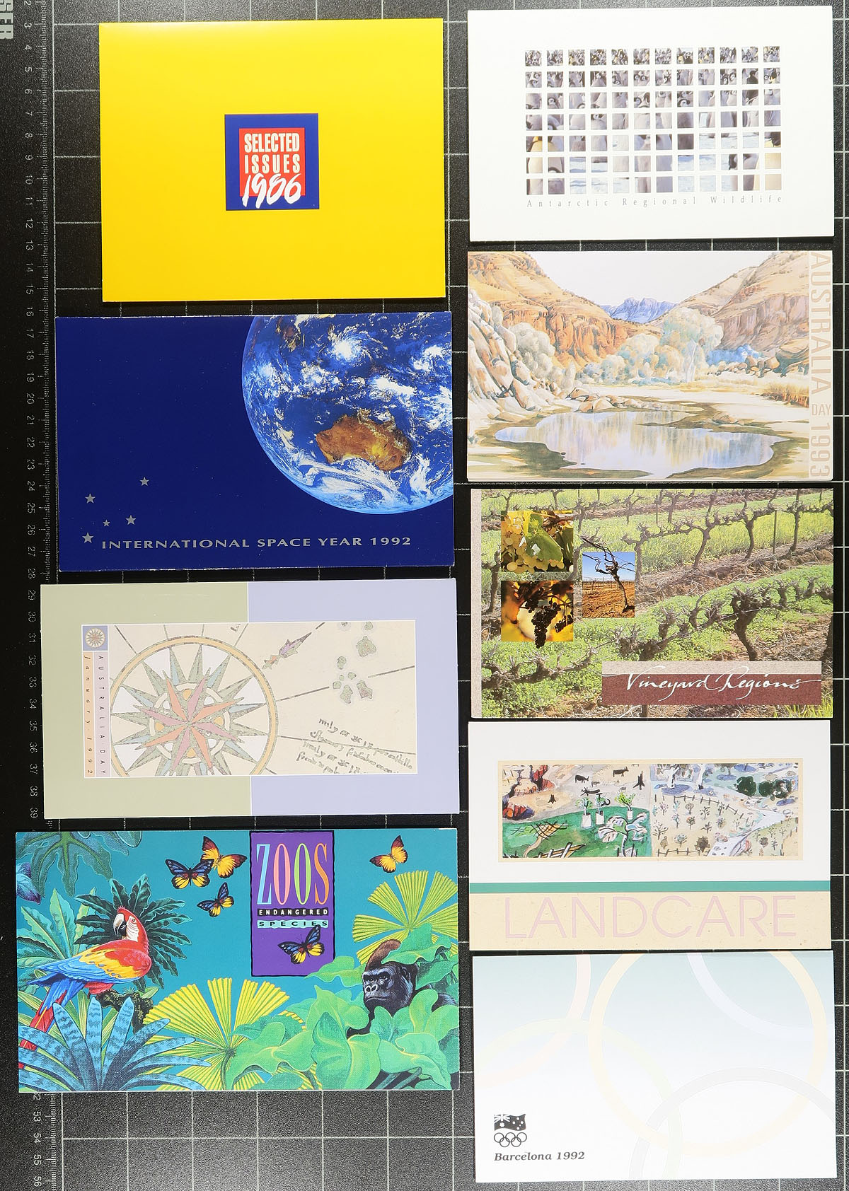 Accumulation of roughly 115 presentation packs, 1980's-1990's. A lovely group with only mild duplication, containing singles, plenty of sets, and a few souvenir sheets, along with a few joint issues and stamped labels, with some items cataloguing $10 and up. Face value for the lot totals AUD$305.00 (most denominations range from 45c to $20). A great group for the topical or thematic collector as we saw several suitable subjects including ships and other transportation, scenery, birds and other animals, flowers and nature, and more. Clean and very fine. Estimate =