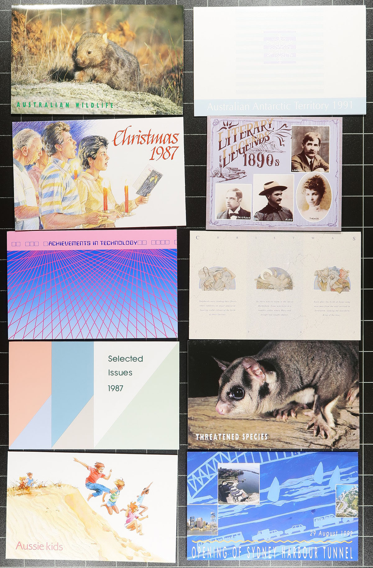 Accumulation of roughly 115 presentation packs, 1980's-1990's. A lovely group with only mild duplication, containing singles, plenty of sets, and a few souvenir sheets, along with a few joint issues and stamped labels, with some items cataloguing $10 and up. Face value for the lot totals AUD$305.00 (most denominations range from 45c to $20). A great group for the topical or thematic collector as we saw several suitable subjects including ships and other transportation, scenery, birds and other animals, flowers and nature, and more. Clean and very fine. Estimate =
