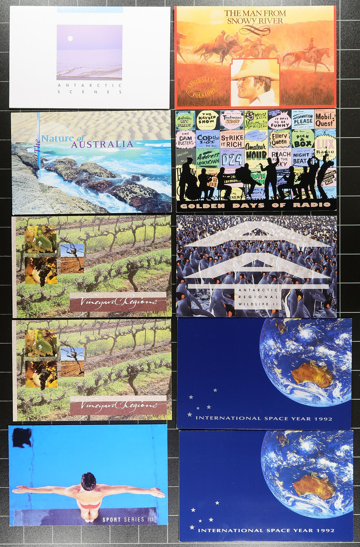 Accumulation of roughly 115 presentation packs, 1980's-1990's. A lovely group with only mild duplication, containing singles, plenty of sets, and a few souvenir sheets, along with a few joint issues and stamped labels, with some items cataloguing $10 and up. Face value for the lot totals AUD$305.00 (most denominations range from 45c to $20). A great group for the topical or thematic collector as we saw several suitable subjects including ships and other transportation, scenery, birds and other animals, flowers and nature, and more. Clean and very fine. Estimate =